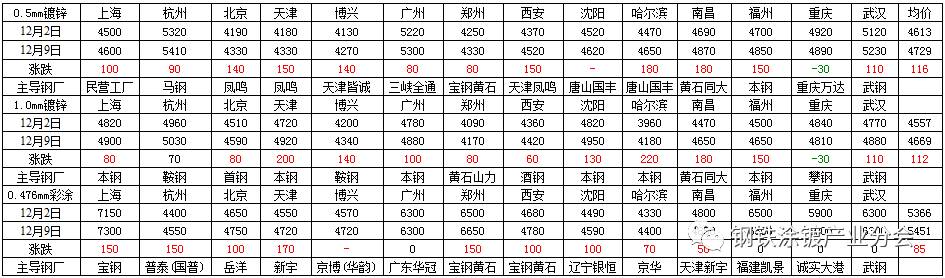 本周涂镀市场价格继续回升,市场需求显得不温不火,有种无量上涨的迹象。目前看,成本仍在不断上升,虽然涂镀产品价格仍在上涨,但整体涨速不如热轧。从镀锌、彩涂工厂反馈,下游拿货积极性极差,每日成交不足前期的50%,成品库存处于上升阶段,后期如成交仍无好转,将会出现减产现象。上游热卷工厂近期压力不大,订单尚可,外加利润丰厚,降价可能性不高。据消息称,1月份宝钢仍有继续提价的想法,且涨幅不低,就后期看,成本动力推升依然存在。近期看,镀锌、彩涂市场需求也并不如热、冷,主要是工程类项目因淡季到来而出现下滑所致。近期来看,热卷成本过高,民营工厂镀锌价格卖不高,短期内压力较大,甚至部分工厂有被逼停的可能。出口方面看,国内价格维持高涨,出口也受此影响,成交量极低,观望情绪极为明显。照此情况来看,短期内市场压力主要价格接受过程中,上游成本推动,对下游影响力暂不明显,成交量放开仍需时日。本周镀锌价格最低的在郑州:镀锌1.0mm4170元/吨,彩涂则是在哈尔滨地区:0.476mm为4400元/吨。截至周五,Myspic镀锌指数为94.03点,较上周上升1.96%,较上月上升10.26%,较去年同期上升75.66%。本周各区域价格仍处于回升阶段,因此后期价格向上空间仍然存在。