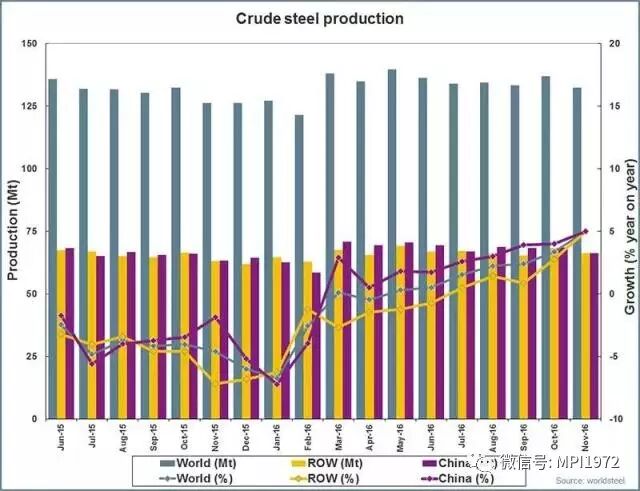 美国2016年11月的粗钢产量为620万吨,同比提高6.8%。
