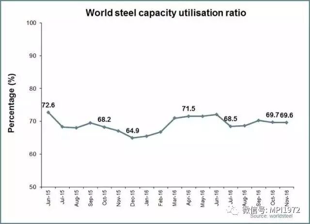2016年11月全球66个国家的粗钢产能利用率为69.6%,去年同月为67.1%,环比下降0.1个百分点。