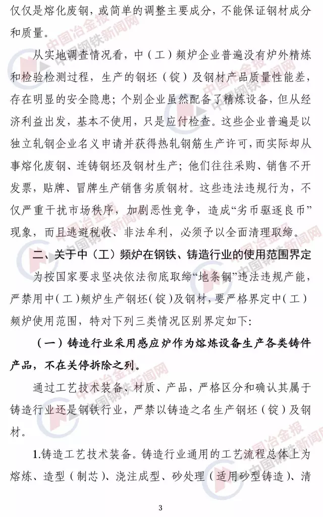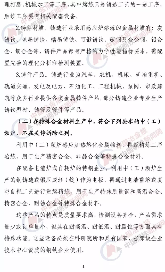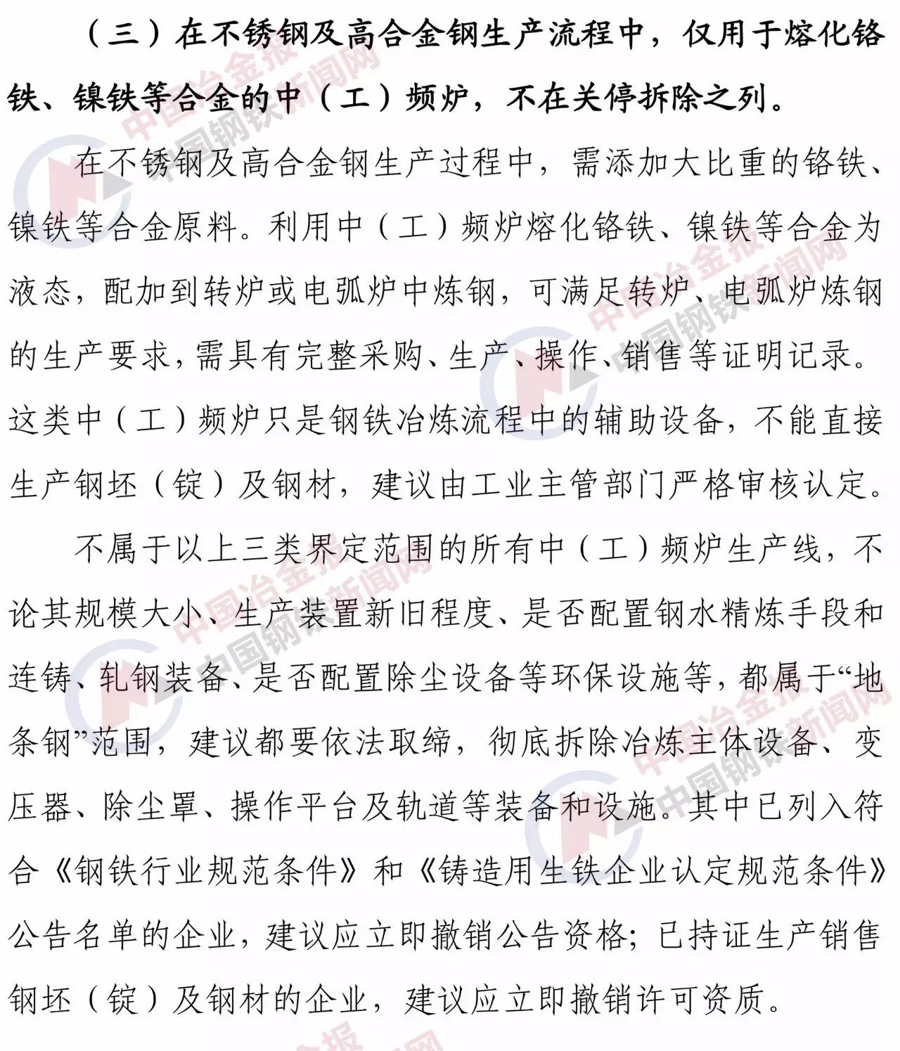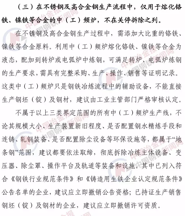 (三)在不锈钢及高合金钢生产流程中,仅用于熔化铬铁、镍铁等合金的中(工)频炉,不在关停拆除之列。