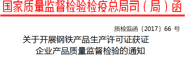 为贯彻落实国务院关于化解钢铁过剩产能有关精神,根据发展改革委、工业和信息化部、质检总局等23部委联合印发的《关于做好2017年钢铁煤炭行业化解过剩产能实现脱困发展工作的意见》(发改运行〔2017〕691号)”和《质检总局办公厅关于加强生产许可证管理淘汰“地条钢”落后产能加快推动钢铁行业化解过剩产能工作的通知》(质检办监函授﹝2017﹞427号)要求,质检总局产品质量监督司决定开展钢铁产品生产许可获证企业产品质量监督检验工作。现就有关事项通知如下:
