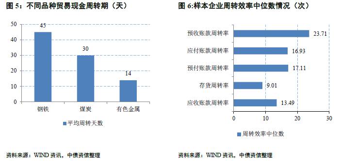 一般来说,不同品种的周转效率不一,若上下游均为生产型企业,由于涉及采购、排产、发货、配送等不同环节,整体贸易流转效率相对较慢;此外,自营以及代理模式下,周转效率亦存在差异,一般来说自营模式相比代理模式流转较慢。以钢铁为例,一般需提前预定,支付采购货款后,钢厂进行排产,再经过发货配送、销售至下游客户,周期相对较长;煤炭贸易采购多以现货为主,流转相对较快;对于有色金属类贸易,多以现货为主且配以套期保值等操作,周转效率较高。根据调研我们了解到,若以真实贸易为基础,上下游均为生产型企业,且下游结算以现金为主的情况下,钢铁、煤炭、有色金属的现金周转天数一般为45天、30天和14天左右。当然在实际贸易业务开展中,贸易企业上下游不乏一些中小型贸易经销商,其实际周转效率或更快,但一般来说缺乏上下游生产基础的贸易业务风险相对更大,尤其对于周转效率很快的贸易企业来说,我们对其贸易业务背景的真实性存疑。考虑到行业内贸易企业多涉及不同品种贸易业务,我们梳理了54家样本贸易企业(样本选取中债资信所覆盖的公开债券市场发债、财务数据公开以及剔除了存在一定规模房地产以及其他业务的54家贸易企业)得经营周转效率指标,以各指标中位数作(见图6)为参考标准从而对贸易企业的周转效率进行评价。
