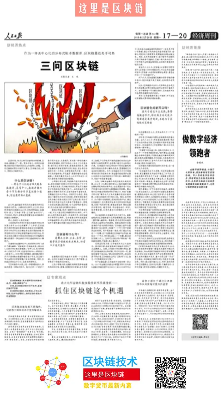2月26日最新消息,《人民日报》经济周刊第17版,发出整版区块链专题报道:《三问区块链(经济热点)》、《抓住区块链这个机遇》、《做数字经济领跑者》,全面的分析了区块链技术、积极的肯定了区块链在各个领域的应用,并呼吁相关部门及时出台区块链技术和产业发展扶持政策,人民日报的积极报道,让区块链产业迎来了一次新的爆发。