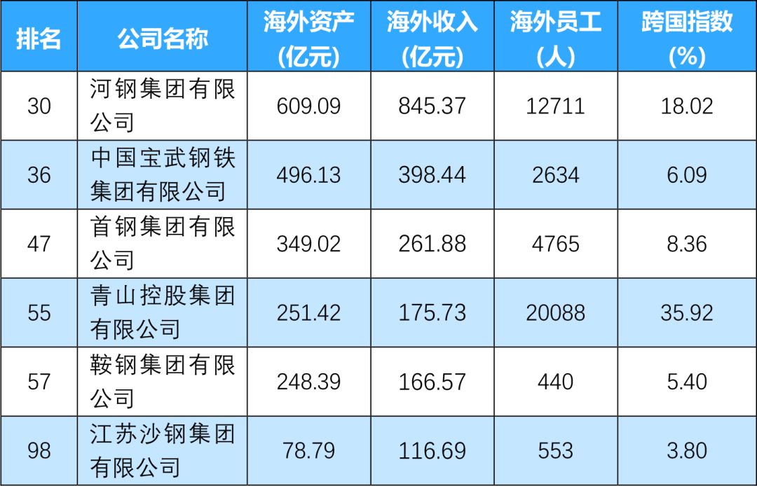 据悉,中国跨国公司100大由拥有海外资产、海外营业收入、海外员工的非金融企业,依据企业海外资产总额的多少排序产生。上榜的6家钢铁企业有在“走出去”,响应国家“一带一路”倡议等方面有哪些亮点?小编为您盘点如下——
