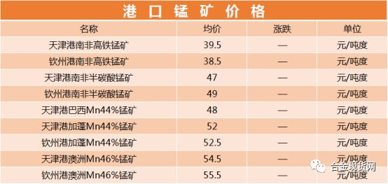 上游锰矿方面:随着高价外矿的到港,港口锰矿成本倒挂加剧,对此锰矿商封盘不出,意欲涨价。合金厂家见此减少采购,虽然从总体上看合金厂家到港补货量有所增加,但不如预期。锰矿商与合金厂家博弈激烈,反映在报价上就是近日港口锰矿价格维持不变。但这种不变不是静态的,是市场各方较量僵持的结果,如果其中一方有变,那市场价也将会随之变化。今日港口锰矿价格如下图: