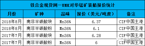 最新:今日,UMK公布8月份对华锰矿装船报价,Mn36%南非块6.37美元/吨度,环比7月份上涨0.09美元/吨度;Mn36%南非半碳酸粉矿6.1美元/吨度,环比上调0.1美元/吨度,CIF中国主港。