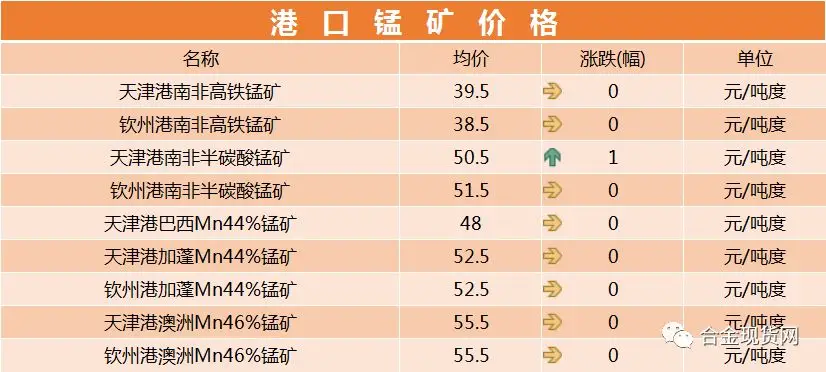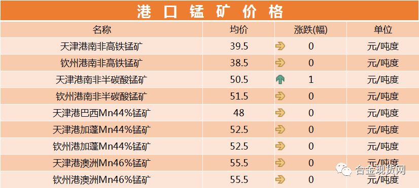 原料锰矿方面:当前锰矿价格整体基本平稳运行,但个别低价矿源价格略有上调,其中,南非锰矿价格上调最多。因后市行情存在太多的不确定性,当前合金厂对原料的采购相对谨慎,且多数按需采购为主。最新统计数据显示:今日天津港南非高铁锰矿价格为39.5元/吨度;天津港南非半碳酸锰矿价格为50.5元/吨度。具体如下图所示: