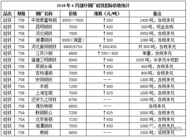 钢招最新了解,湘潭钢铁6月份硅铁75B招标价格敲定为7050元/吨,环比5月价格上涨650元/吨,采购量1000吨;北京首钢6月份硅铁75A招标价格敲定为7150元/吨,环比5月价格上涨650元/吨,采购量3000吨;鞍钢联众6月份硅铁75A招标价格敲定为7200元/吨,环比5月价格上涨625元/吨,采购量3000吨;具体如下: