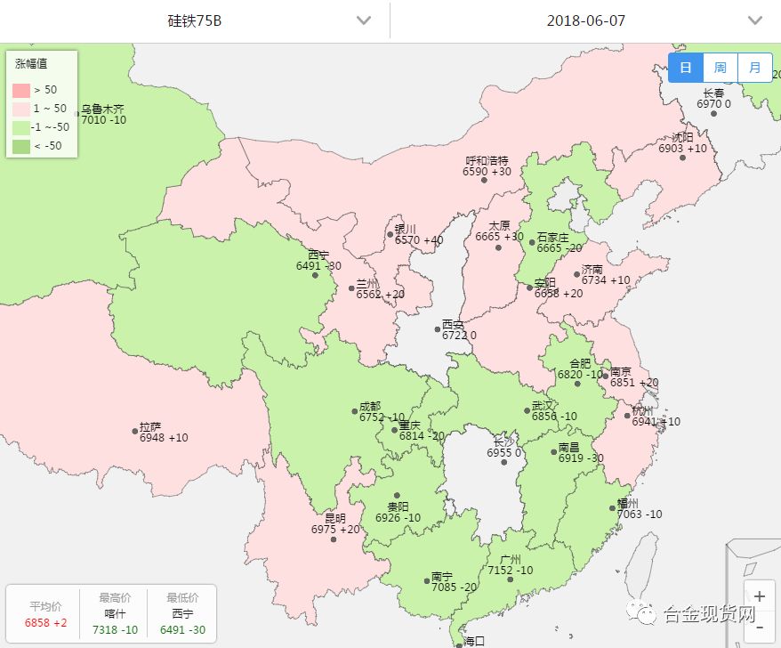 据铁合金现货网合金宝指数显示,今日河南、河北、山东、江苏四个地区硅铁75B含税包到价格集中在6658—6851元/吨之间,价格相比昨日窄幅震荡为主(其中河北地区75B硅铁含税包到价为6665元/吨,跌幅20元/吨)。