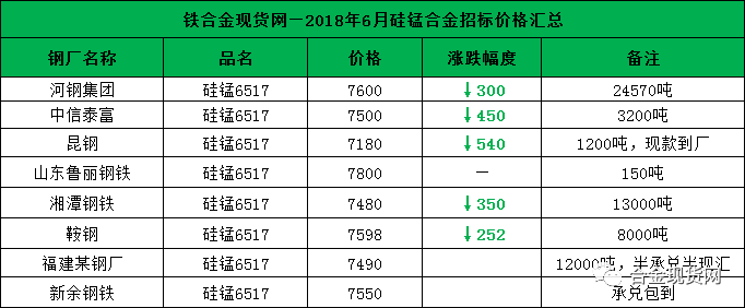 钢厂招标最新动态:1、湘潭钢铁敲定6月硅锰合金采购价格为7480元/吨,较上轮询盘价格涨30元/吨,较上月采购价格跌350元/吨,采购量13000吨左右;2、鞍钢敲定6月硅锰合金采购价格为7598元/吨,较上月采购价格跌252元/吨,采购量8000吨左右。具体以各自合同执行价格为准;3、福建某钢厂6月硅锰合金招标价格为7490元/吨,采购数量12000吨(半承兑半现款);4、江西新余钢铁6月硅锰合金招标价格敲定,为7550元/吨(承兑包到)。