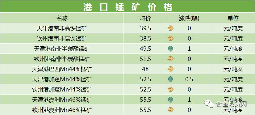 原料锰矿方面:随着高价锰矿陆续到港,近期矿商盼涨气氛增加,今日,天津港部分矿种也出现小幅上调。据本网站相关人员获悉,现澳块46%报价在55-56元/吨度之间,南非块37%价格在50-51元/吨度。具体如下表所示: