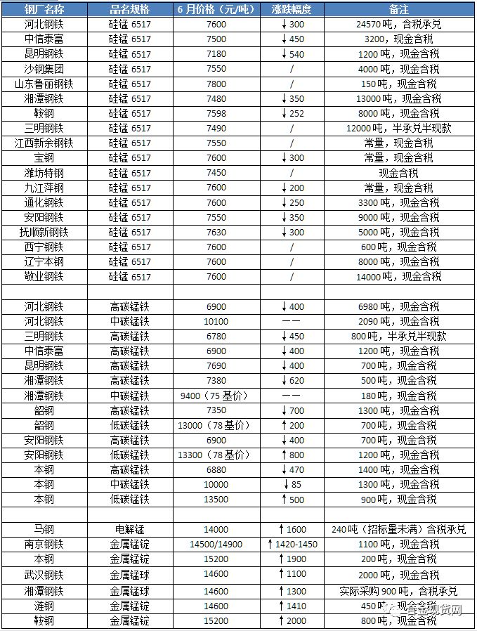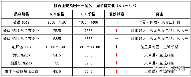 对于上周硅锰6月钢招格局趋于明朗,北方某大型钢厂最终提涨定价。现货市场上,合金厂家盼进一步探涨的意愿也“蠢蠢欲动”。本周据现货网跟进了解,周初时硅锰市场暂处于盘稳僵持状态,毕竟合金厂极尽争取来的7600元/吨的钢招定价与当前现货市价相差空间并不大,各方心态稍显谨慎。但经过时间推进,周中港口锰矿价格波动探涨,此时就合金市场而言,硅锰现货可售资源依旧有限,厂家均以执行钢厂订单为主,加之受环保回头看影响,不少北方地区厂家提涨意志坚定,宁夏及内蒙地区6517#价格报至7400—7500元/吨之间开始活跃。而南方地区厂家持观望态度较为明显,不过环保“回头看”亦波及广西地区,库存也是紧张。