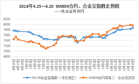 合金宝指数显示,6月20日硅锰6517#价格有30—50元/吨左右的涨幅,其中,河南、河北、山东、江苏等地现金含税包到价格在7865—8069元/吨(含运费),具体如下: