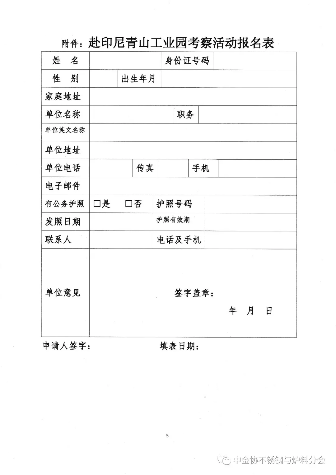 请各有关会员单位积极参加这次赴印尼青山工业园考察活动,并将参加人员报名表(见附件)于7月15日前报中国金属材料流通协会不锈钢与炉料分会。