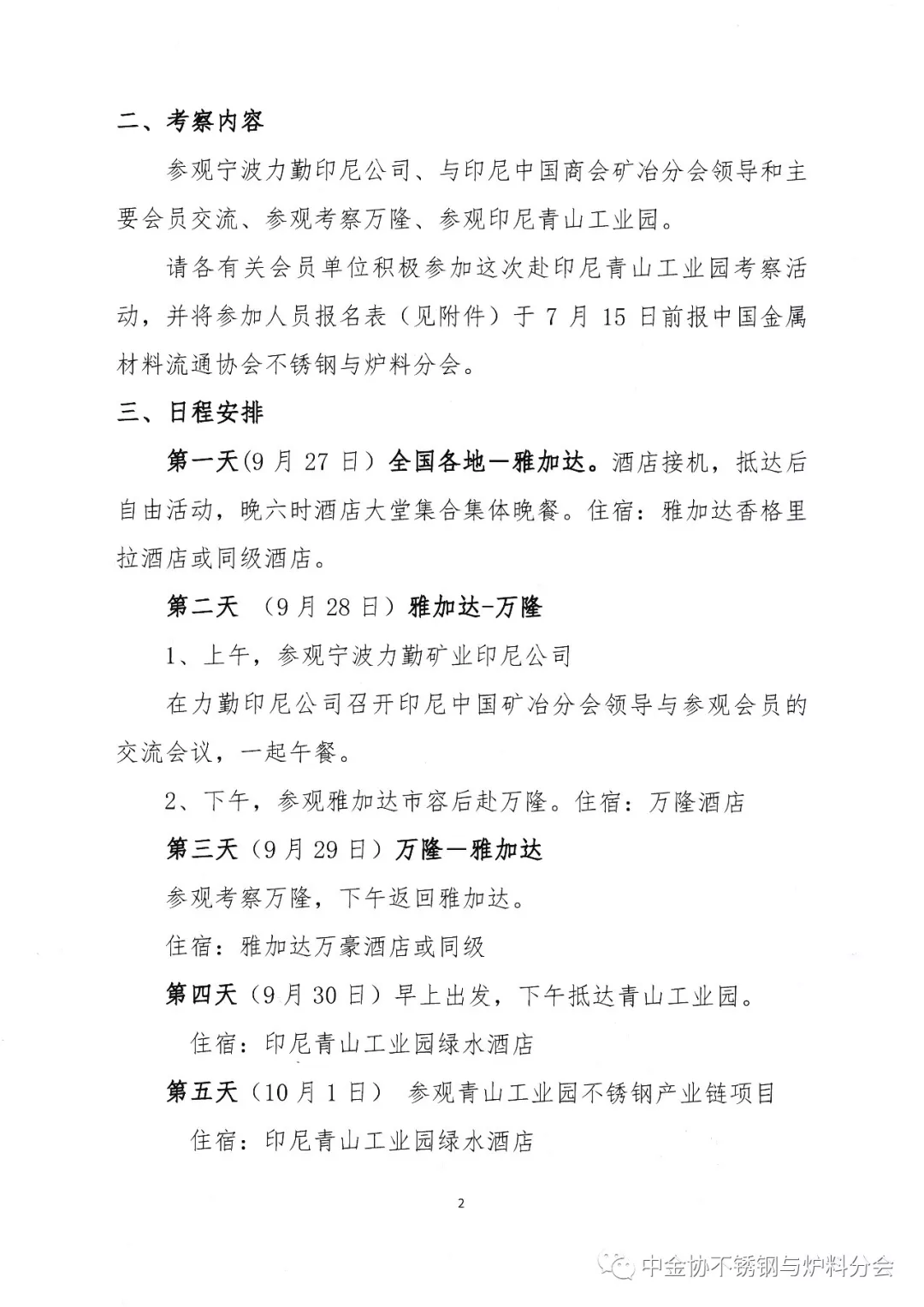 3.考察费用:中国金属材料流通协会不锈钢与炉料会员约2万元人民币/人,包括国外食宿、印尼城市间交通、考察及相关服务费用。本次考察活动计划20人,并将根据实际成团人数适当调整最终价格。