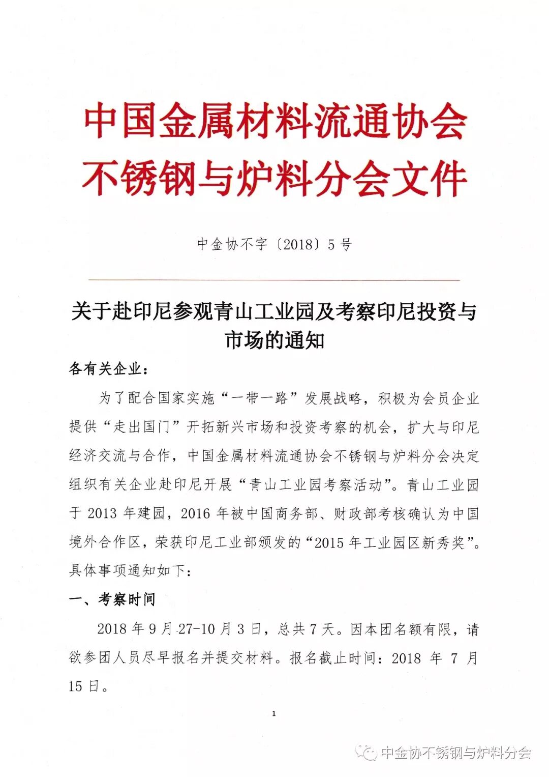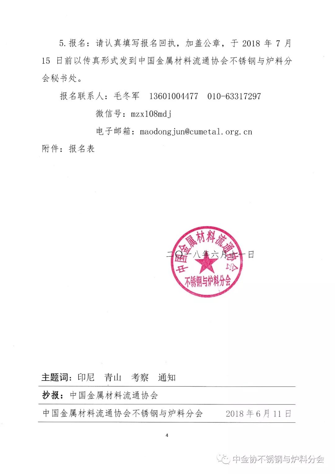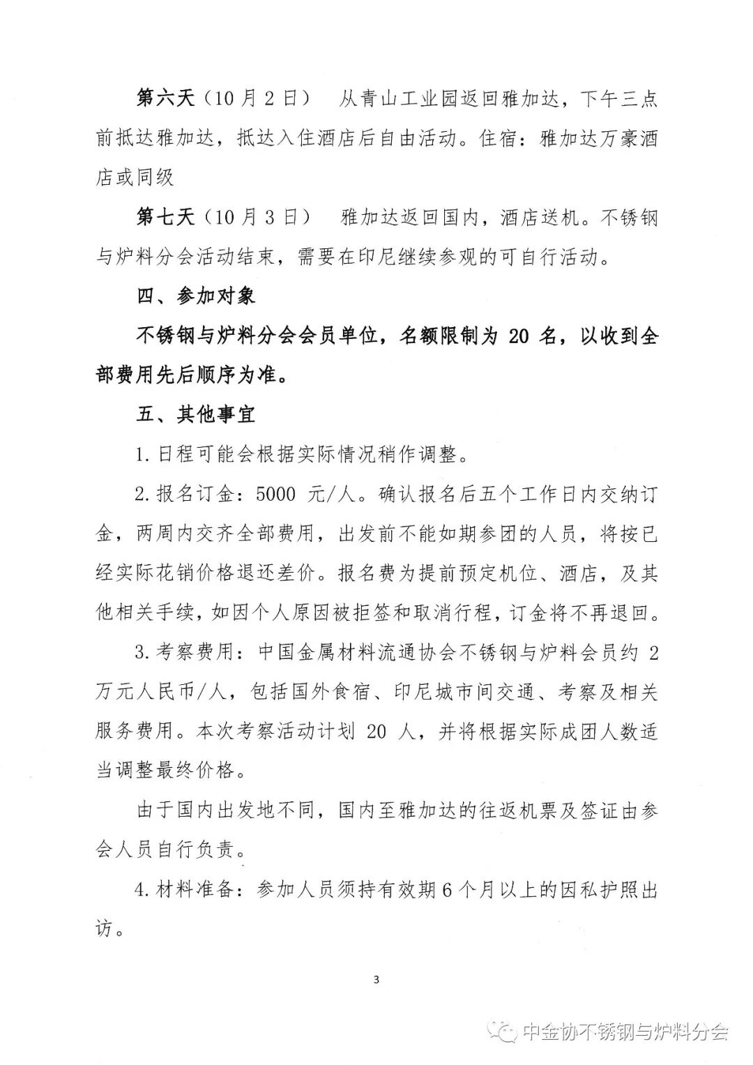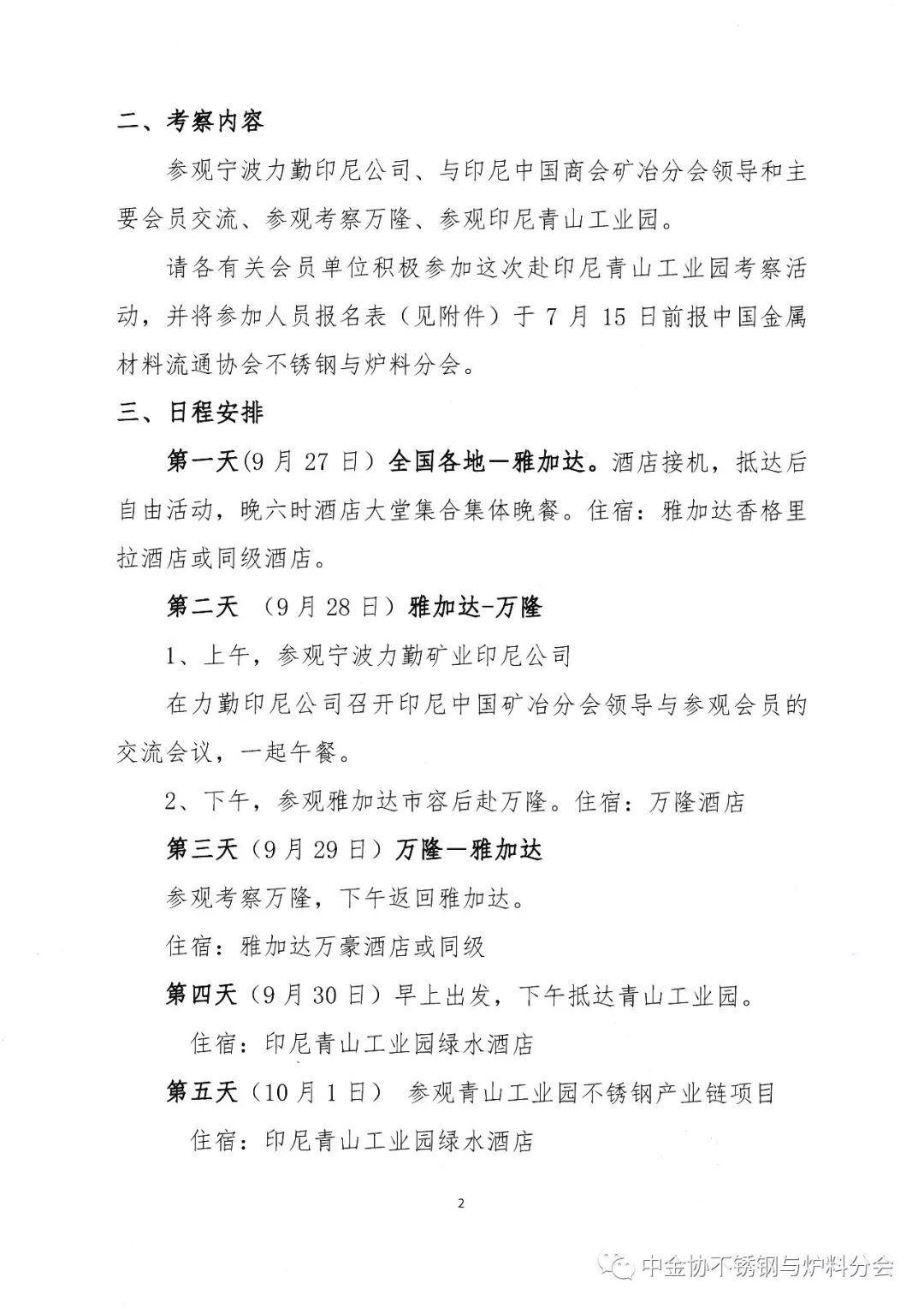 3.考察费用:中国金属材料流通协会不锈钢与炉料会员约2万元人民币/人,包括国外食宿、印尼城市间交通、考察及相关服务费用。本次考察活动计划20人,并将根据实际成团人数适当调整最终价格。