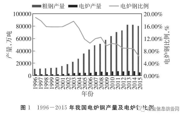 世界上第一台电弧炉是由法国人Heroult于1899年发明,然而我国真正开始大力发展电弧炉则是在上世纪80年代末90年代初,特别是1993 年“当代电炉流程和电炉工程研讨会”在上海召开后,我国电弧炉炼钢的技术和产量都不断提高[3-4] 。图1是1996-2015年我国电炉钢产量及电炉钢比例图表。从图中可以看出,从1996年到2014年,电弧炉产量逐渐提高,然而粗钢总产量的增长速度却要明显快于电炉钢的产量,尤其是2000年之后,中国粗钢产量迅猛发展,使得我国电炉钢的比例反而下降,从1996年接近20%降低到6%-8% 。在2015年,我国粗钢及电炉钢产量都有所降低,尤其是粗钢产量在近年来首次出现了负增长。这一年电炉炼钢的比例也降低到了6.1%。