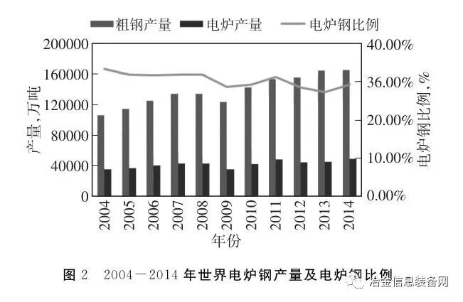 图2为2004-2014 年世界电炉钢产量及电炉钢比例图表。由图可见,近十年来世界粗钢及电炉钢的产量都略微有所增大,电炉钢的比例一直维持在30%左右,这一比例远远高于我国。在世界电炉钢产量较高的国家中,美国、印度的电炉钢产量超过5000万吨,电炉钢比例都超过了60% ,埃及虽然电炉钢产量只有600多万吨,但是电炉钢比例高达92%。从电炉钢比例上看,我国电炉钢还有进一步发展空间。