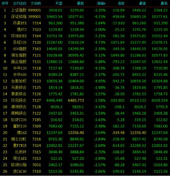 今日开盘亚太股市就暴跌,其中日股日经225指数开盘跌1.8%至22,267点,东京证交所MOTHERS指数期货触发熔断机制,最新数据显示,日经225下跌4.73%;今日港股开盘即大跌超过1200点,最新数据显示,恒生指数下跌5.13%;今日A股也加入全球抛售潮,日内A股三大股指全部低开低走,截至收盘,沪指跌3.35%,失守3400点关口;深成指跌4.23%;创业板跌5.34%,跌出3年新低,失守1600点关口。