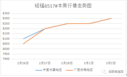 回顾本周硅锰的市场行情,节前硅锰呈稳中趋弱的格局,主流报价在7900-8000元/吨。节后归市,硅锰市场活跃度明显增高。周初,上游原材料锰矿价格的持续上涨带动了硅锰市场价格的上涨,硅锰市场有所回暖,厂家陆续将价格上调至8200-8300元/吨左右,低价不愿出货心理明显。与此同时,三月份钢厂招标也逐渐拉开帷幕,业内将目光聚焦在代表钢厂的招标价格出台。继昨日河钢首轮询盘价定在8400元/吨,二次询盘价定在8500元/吨,市场受此价格影响,盼涨热情有所下降。今日河钢已敲定最终招标价格为8600元/吨,较初次询盘价上涨200元/吨,二次询盘价上涨100元/吨,业内表示对此价格能够接受,目前已出的钢厂招标价格除个别较低以外,主流价格基本围绕在8500-8600元/吨上下,近期硅锰市场上活跃度较高,厂家及贸易商表示对后市持有一定信心。