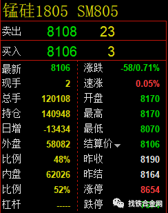 期货方面,今日硅锰1805合约高开低走,收于8106跌58点,跌幅0.71%,持仓方面减13434至140948手,成交量达120108手!