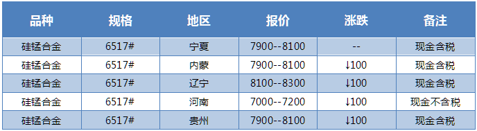 周初,硅锰市场主流报价在7900--8100元/吨,有个别厂家报价在7700现金含税出厂。硅锰市场依然弱稳运行,成交略显清淡。