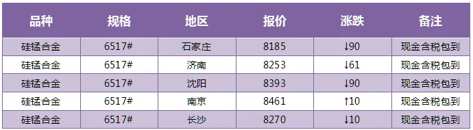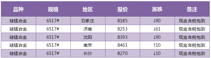 今日合金宝指数暂无较大波动,石家庄地区8185元/吨,较上周下跌90元/吨;济南地区8253元/吨,较上周下跌61元/吨;沈阳地区8393元/吨,较上周下跌90元/吨;南京地区8461元/吨,较上周上涨10元/吨;长沙地区8270元/吨,较上周下跌10元/吨。