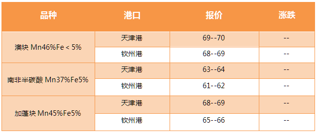 首先是锰矿,今日港口锰矿价格与上周持平。具体如下: