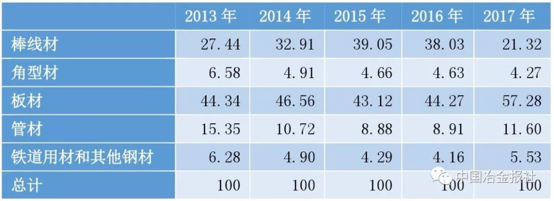 从近几年各钢材品种的占比来看(见下表),2013年~2016年,板材出口占比一直在44%左右徘徊,2017年,这一比例上升至57.28%,比上一年提高了13个百分点。