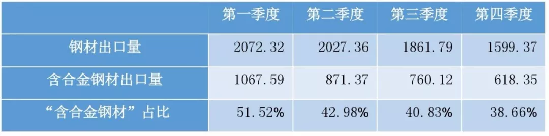 实际上,2017年是我国钢铁行业去产能的攻坚之年,同时全面取缔了“地条钢”。在这样的背景下,出现“其他热轧合金钢条杆”项下钢材出口量的大幅减少也就不奇怪了。并且,这一趋势从2017年各个季度含微量合金钢材的出口数据(见下表)中也可以看出。2017年第一季度到第四季度,“含合金钢材”占比呈逐季下降的趋势,而这一比例在2015年曾到达60.1%的高点。