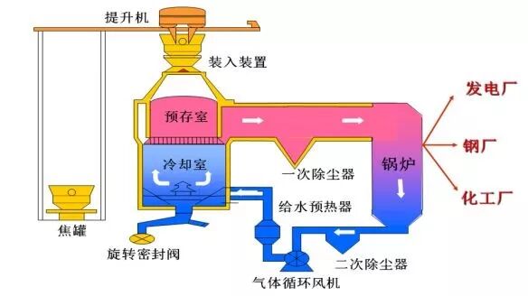 用循环气体冷却红热焦炭,同时回 收的显热产生高温高压蒸汽,供企 业使用或发电。