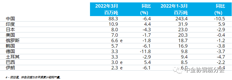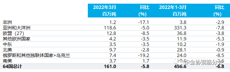 2022年3月,全球64个纳入世界钢铁协会统计国家或地区的粗钢产量为1.610亿吨,同比下降5.8%。