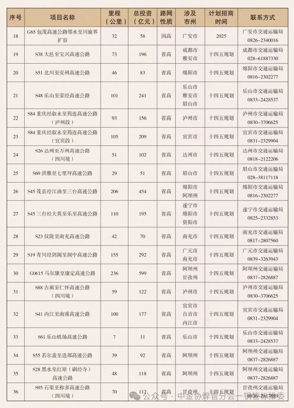 分别是成都至汶川(84公里、316亿元)、G5成都至雅安段扩容(159公里、271亿元)、广安绕城西段(76公里、111亿元)、南江至三台(270公里、485亿元)、平昌至仪陇(75公里、154亿元)、南充至大竹(92公里、216亿元)、G4215成自泸高速扩容(281公里、414亿元)、城口经宣汉至大竹至邻水(235公里、454亿元)、G65邻水至川渝界扩容(32公里、58亿元)。