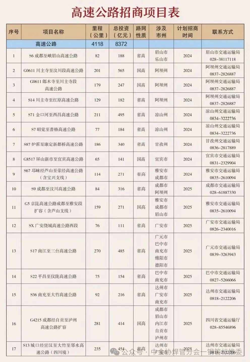 分别是成都至峨眉山(82公里、188亿元),阿坝州G0611川主寺至汶川(201公里、565亿元)、G0611郎木寺至川主寺(179公里、247亿元)、川主寺至红原(129公里、182亿元)3个项目组成的打捆招商包,总里程509公里,总投资994亿元。凉山州金口河至西昌(211公里、495亿元)、昭觉至普格(77公里、184亿元)2个项目组成的打捆招商包,总里程288公里,总投资679亿元。炉霍至康定新都桥(186公里、340亿元);G8517屏山新市至宜宾(65公里、141亿元);邛崃经芦山至荥经(114公里、271亿元)。