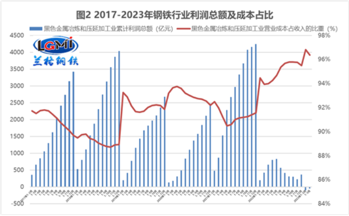 对于钢厂来说,受到了旺季需求释放和成本逐渐承压的双重影响,逐步由亏损转为盈利,根据国家统计局发布数据推算,3月份黑色金属冶炼和压延加工业单月盈利52.5亿元,实现了今年以来的单月首次盈利,但从一季度来看,国内钢铁行业1-2月亏损101亿元,3月份盈利52.5亿元,1-3月亏损48.4元,行业减亏压力依然较大。而同期,重点钢铁企业却实现连续3个月的盈利局面,据中国钢铁工业协会统计数据显示,2023年1月份、2月份、3月份,重点统计钢铁企业利润总额分别为25.45亿元、28.59亿元、103.25亿元;一季度,重点钢铁企业利润总额159.68亿元,同比下降71.49%。