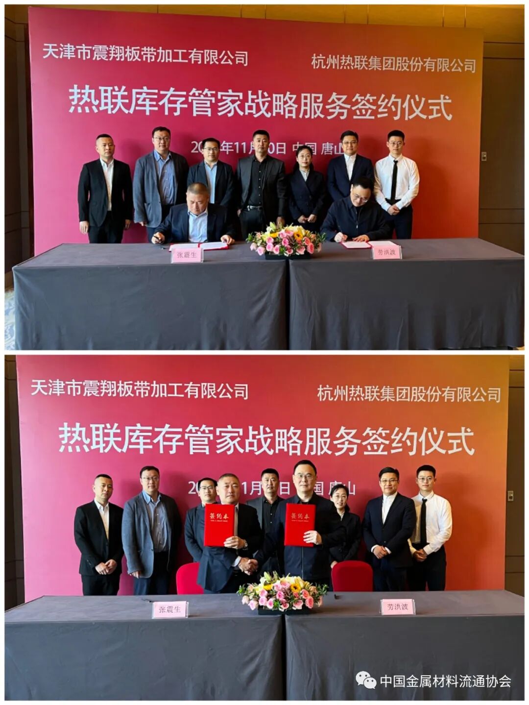 11月10日,天津震翔板带加工有限公司与杭州热联集团股份有限公司在河北唐山香格里拉大酒店举办了庄严而隆重的“库存管家战略服务签约仪式”。中国金属材料流通协会作为合作双方的牵头单位,委派行业发展研究中心主任兼风险管理专委会副秘书长张艳菊出席并主持了仪式。