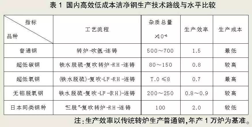 四是高效低成本洁净钢生产技术。高效低成本洁净钢生产技术最初由日本提出,其核心是开发采用铁水“三脱”(脱硅、脱硫、脱磷)预处理工艺使转炉全部产品的杂质总量≤100ppm,生产效率比传统转炉提高1倍,生产成本不高于传统转炉普通钢生产。根据国内炼钢厂的技术装备水平,开发采用高效低成本洁净钢生产流程的基本特点是根据不同品质钢材的质量要求采用最经济、最高效的生产工艺,提高产品的竞争力(见表1)。虽然国内高效低成本洁净钢生产工艺与日本的同类工艺相比,在产品质量和生产效率方面尚有一定差距,但与其他国家相比仍具有较强的市场竞争力。
