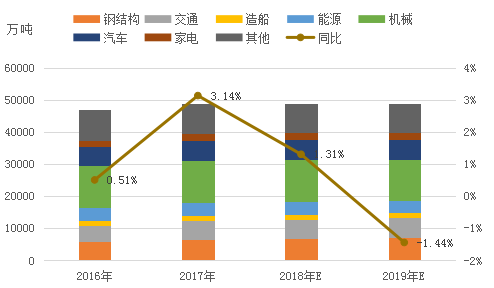 2018年环保限产导致阶段性供给不足,推动钢价重心上移。2019年国内经济下行压力较大,需求端的变动将主导钢市运行。通过对宏观面以及下游行业分析,预计2019年需求基本持平,分行业来看: