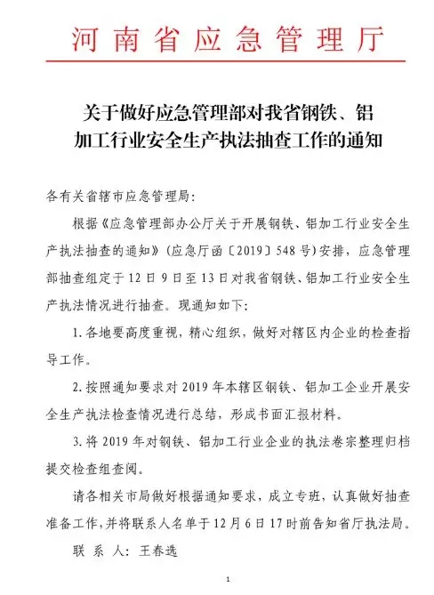 近日,应急管理部抽查组定于12月9日-13日对河南省钢铁、铝加工行业安全生产执法抽查。