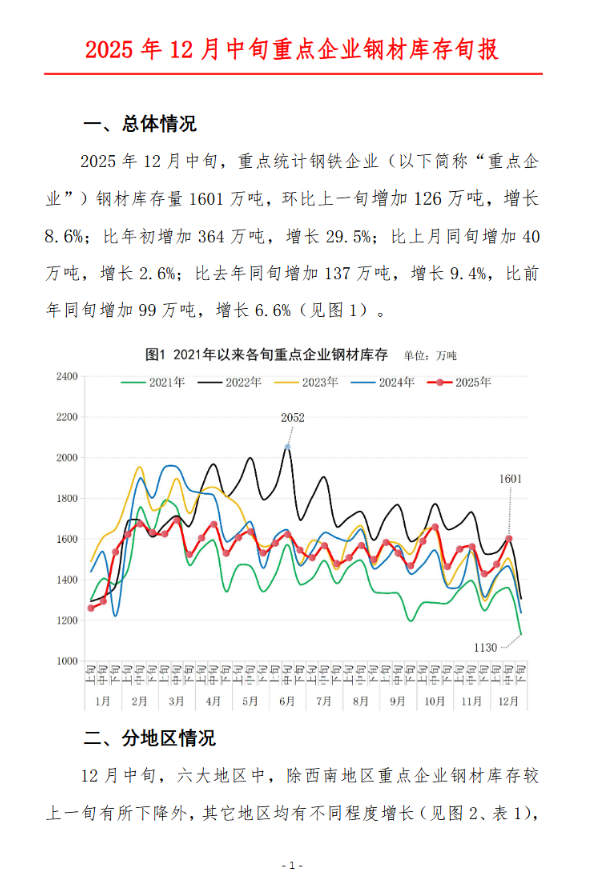 2025年12月中旬,重点统计钢铁企业钢材库存量1601万吨,环比上一旬增加126万吨,增长8.6%;比年初增加364万吨,增长29.5%;比上月同旬增加40万吨,增长2.6%;比去年同旬增加137万吨,增长9.4%,比前年同旬增加99万吨,增长6.6%。